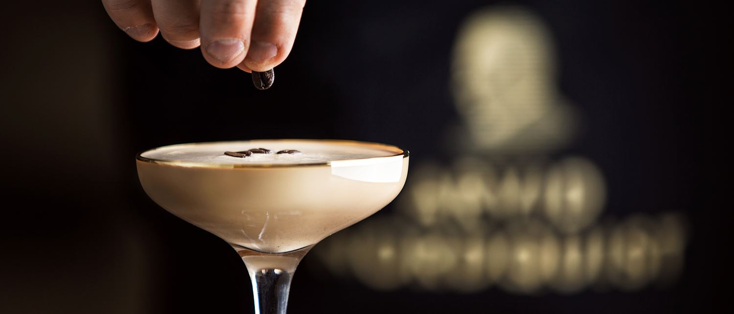 Garnera med kaffebönorna (enligt italiensk tradition ska en espresso martini garneras med varken fler eller färre än tre hela kaffebönor – en för hälsa, en för lycka och en för kärlek. Okej, vi har fyra på bilden, men så älskar i ju kaffe, så vi adderar en extra böna bara för just det).