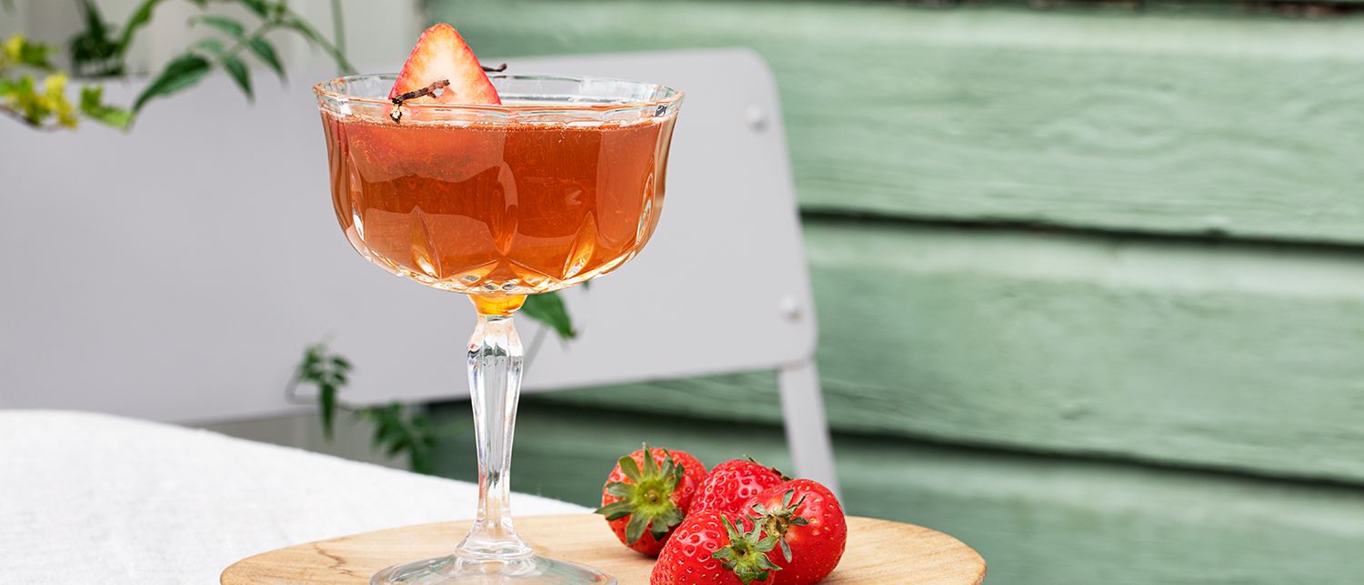 Vid servering: Häll tekoncentratet i en shaker med is. Skaka snabbt. Sila ner i ett coupeglas. Toppa med sodavatten. Sätt jordgubben på en pinne och lägg över glaset.