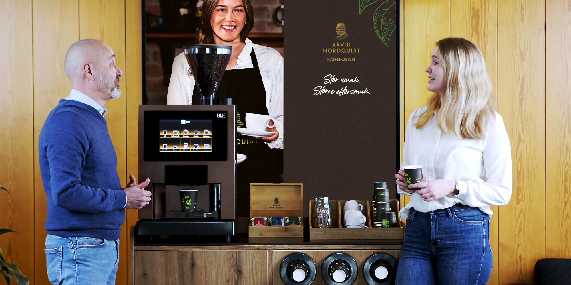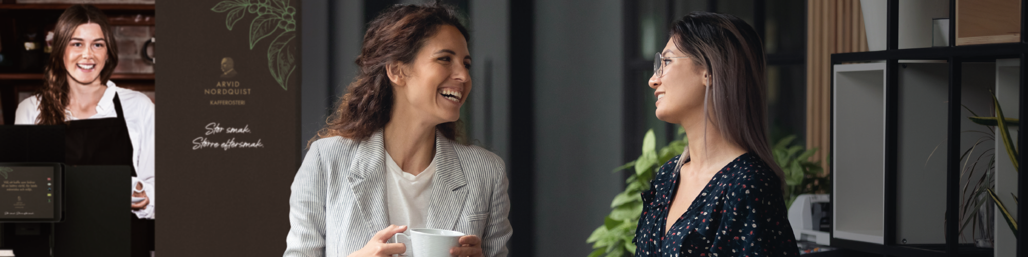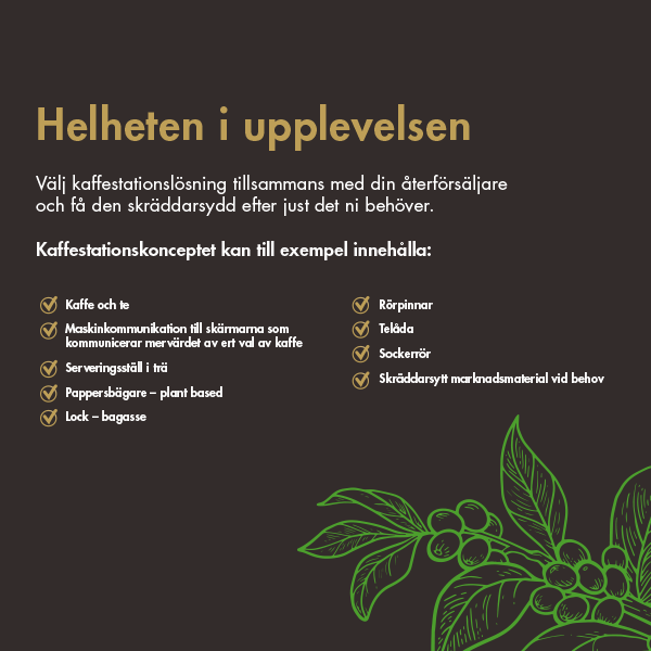 En inspirerande kaffeupplevelse! För en arbetsgivare är det viktigare än någonsin att skapa en attraktiv arbetsplats. Dagens medarbetare värdesätter en inbjudande och trevlig miljö, likväl ett företag som står för goda värderingar. Helhetsupplevelsen på arbetsplatsen kommer göra medarbetarna mer nöjda och nöjdhet ger bättre prestation. Underskatta inte vikten av ett bra kaffe i en inspirerande miljö!
