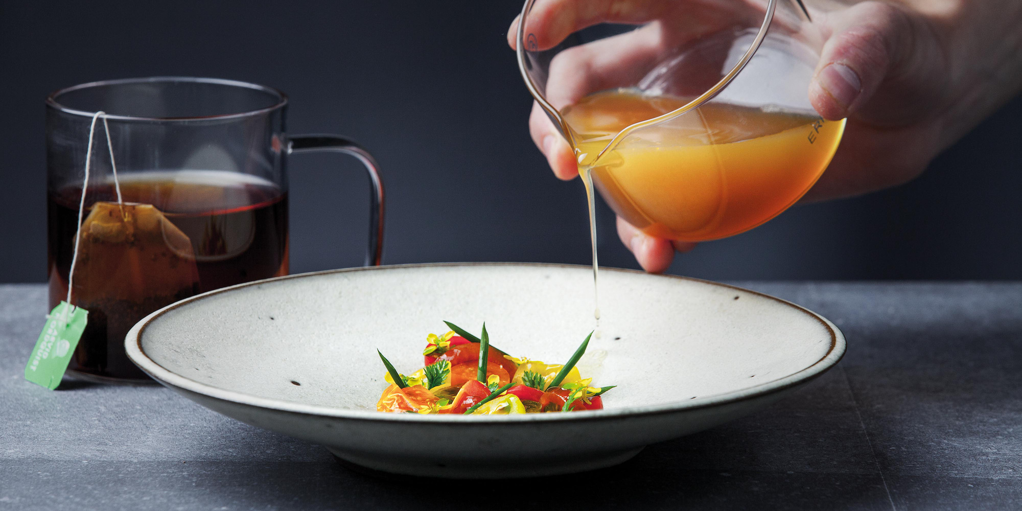 4. Häll sedan på tomatvattnet och lite gräslöksolja på tallriken – gärna framför gästen!