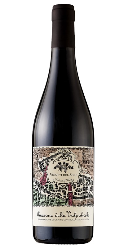Vigneti del Sole Amarone DOCG har en mörkröd färg med doft av torkade körsbär, björnbär, russin, kakao och vanilj. Smaken är rik och fyllig med generös frukt samt välintegrerad fatkaraktär, fin balans och långt avslut.